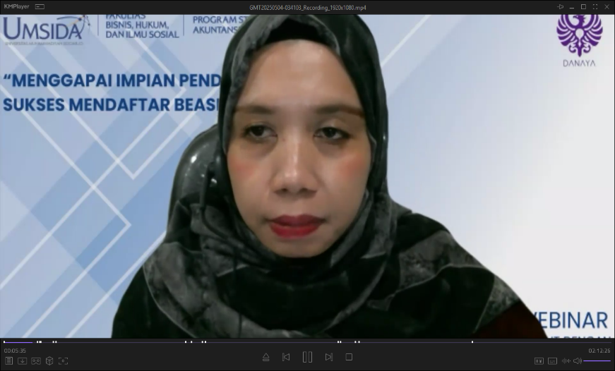 Minggu, 04 Mei 2025, Program Studi Akuntansi Universitas Muhammadiyah Sidoarjo (UMSIDA) telah sukses menyelenggarakan kegiatan webinar bertema “Menggapai Impian Pendidikan: Tips Sukses Mendaftar Beasiswa LPDP”. Kegiatan ini diprakarsai oleh Program Studi Akuntansi sebagai panitia pelaksana dan dilaksanakan secara daring melalui Zoom Meeting. Webinar ini diikuti oleh lebih dari 350 peserta yang terdiri dari mahasiswa UMSIDA dan peserta umum dari berbagai daerah di Indonesia.
