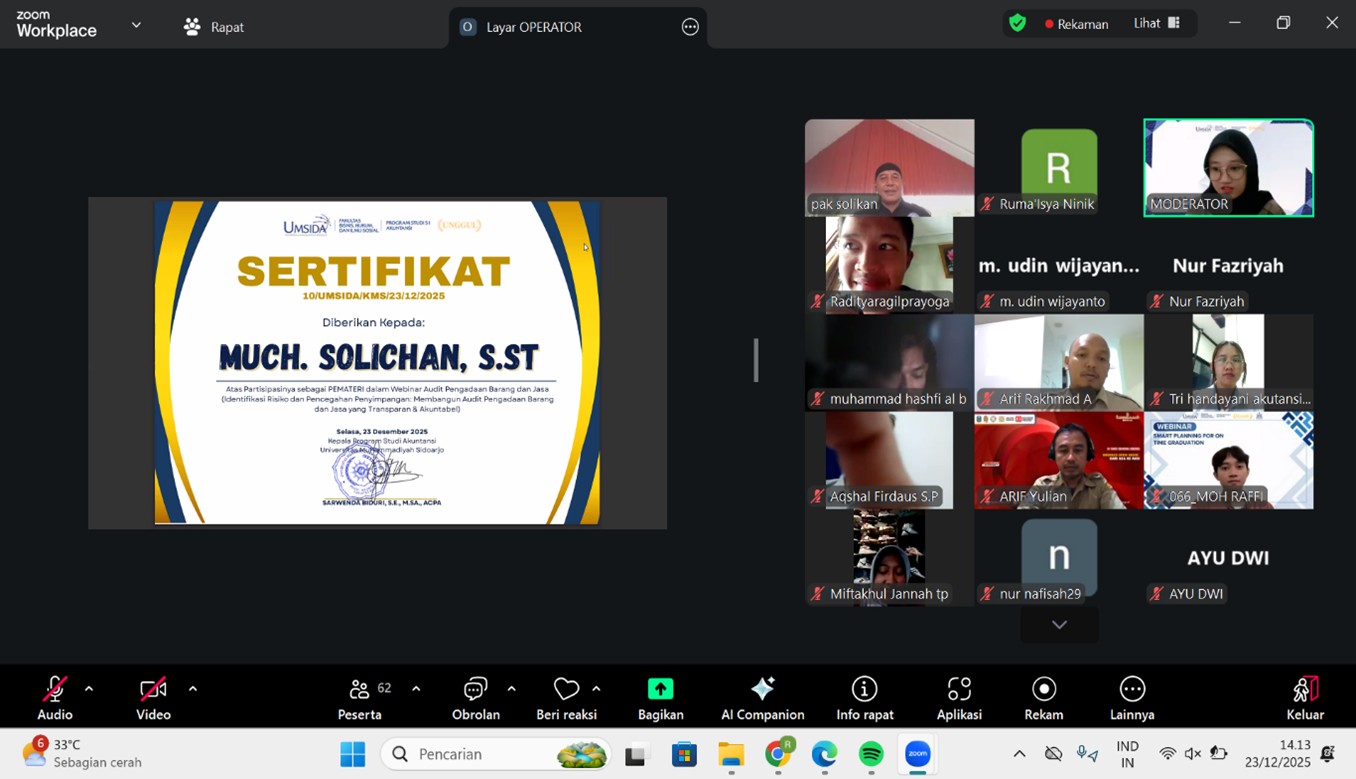 Program Studi Akuntansi Universitas Muhammadiyah Sidoarjo telah menyelenggarakan kegiatan Webinar Audit Pengadaan Barang dan Jasa dengan tema “Identifikasi Risiko dan Pencegahan Penyimpangan: Membangun Audit Pengadaan Barang dan Jasa yang Transparan dan Akuntabel”. Kegiatan ini dilaksanakan pada Selasa, 23 Desember 2025 melalui Zoom Meeting dan diikuti oleh mahasiswa aktif Universitas Muhammadiyah Sidoarjo serta peserta umum. Webinar ini bertujuan untuk memberikan pemahaman mengenai proses audit pengadaan barang dan jasa serta meningkatkan kesadaran akan pentingnya transparansi dan akuntabilitas dalam tata kelola pengadaan.